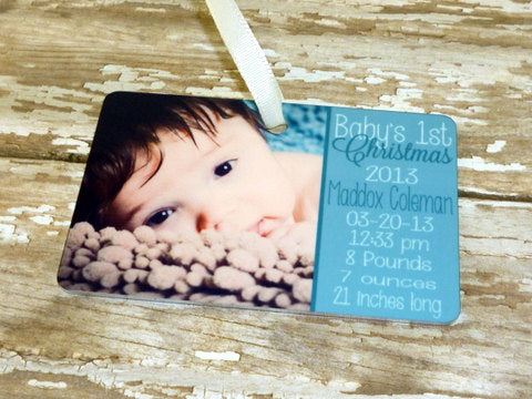 This double sided adorably unique baby's first Christmas birth announcement ornament will be the perfect addition to your Christmas tree this holiday season. This ornament is made from white Gloss Aluminum and is 2"x 3". This ornament is sturdy, yet light in weight to avoid weighing the branches on your tree down. Perfect for gift giving with a hand tied bow on the ornament and loop for hanging.