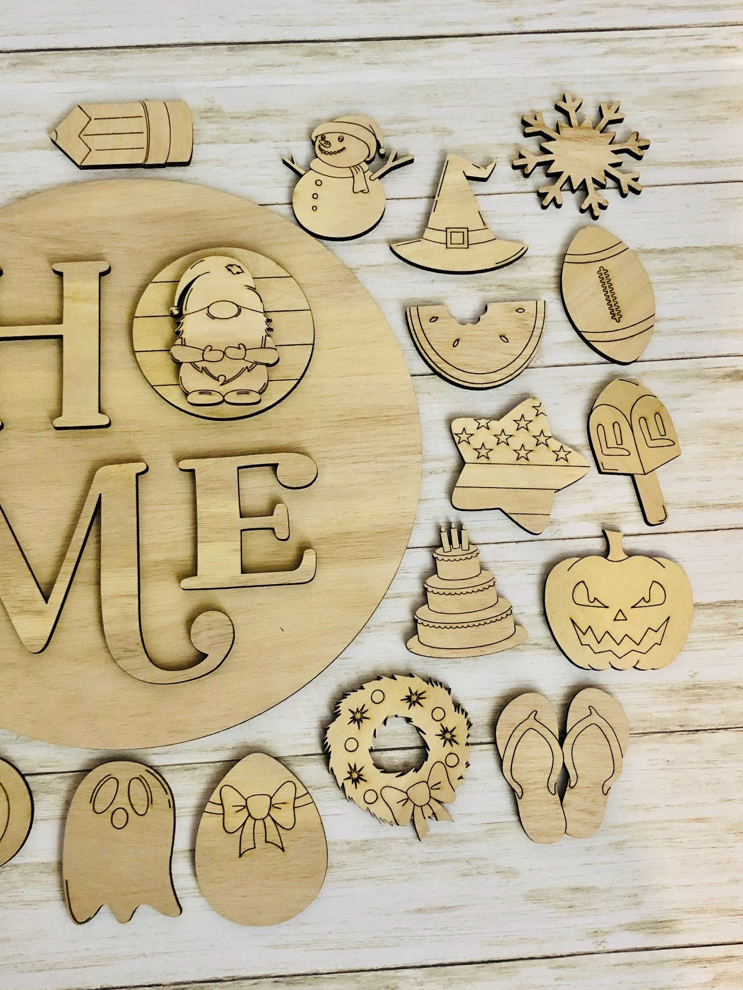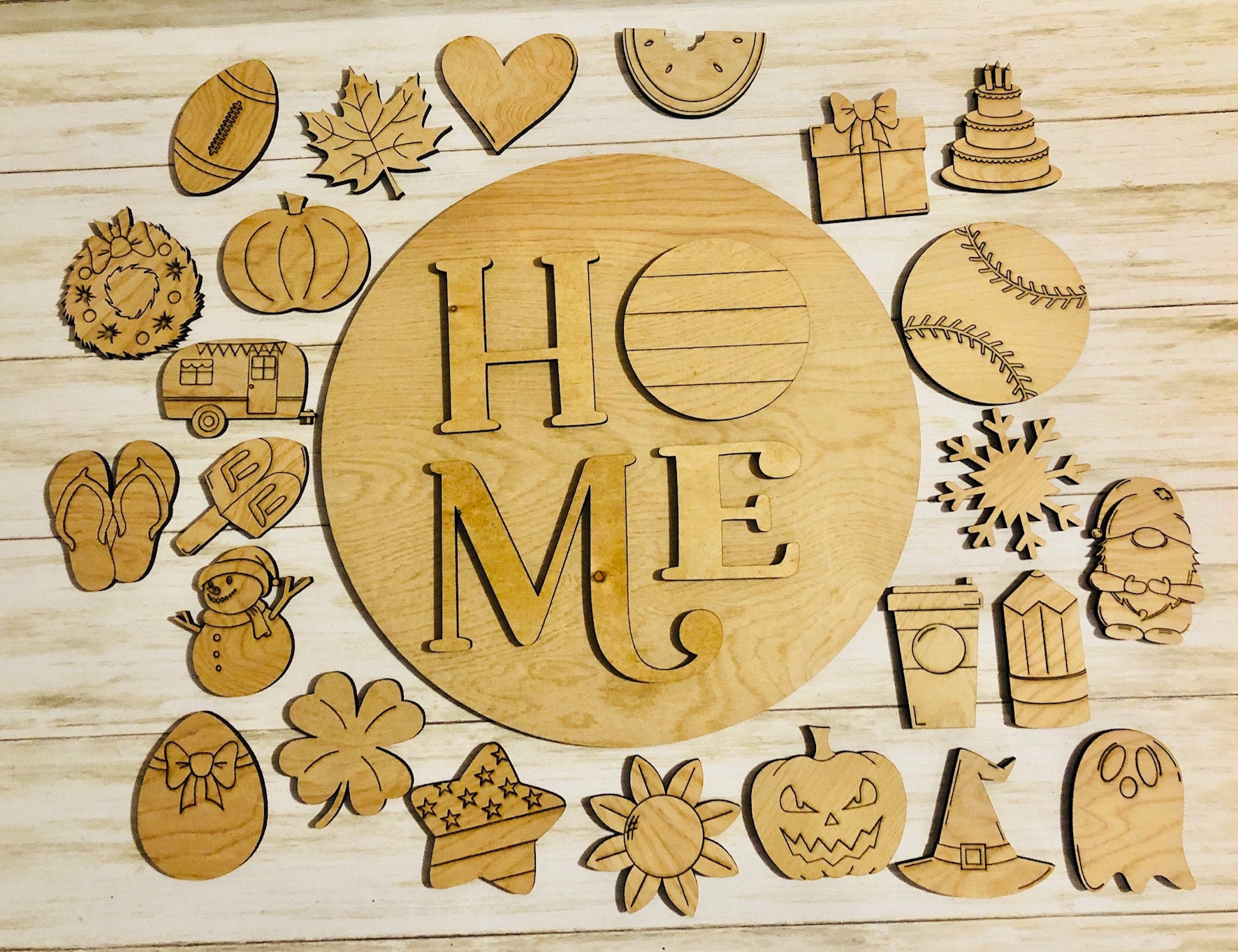 You will LOVE this adorable interchangeable Home sign. It adds the perfect farmhouse touch to your front door or home. What a fun project to paint for girls night! Fine Paint pens work great for this type of project.